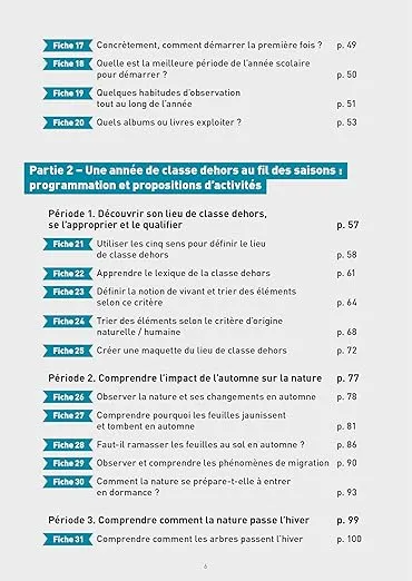 La premier nous a été conseillé par notre formatrice sur l'école du dehors. Il s'agit d'un ouvrage de Crystèle Ferjou : "Enseigner en classe dehors". C'est un ouvrage explicite, qui précise bien les enjeux et la façon dont on peut mettre en place l'école du dehors. L'ouvrage se découpe en 2 grandes parties :